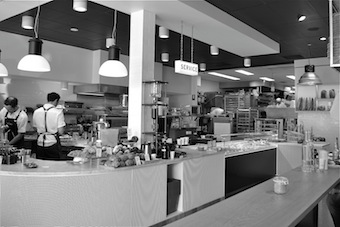 Flooded with sunlight and open air, the fit-out is stunning. Crisp and white, a mini market place of fresh pastries, bread, pantry fillers and magazines for purchase.