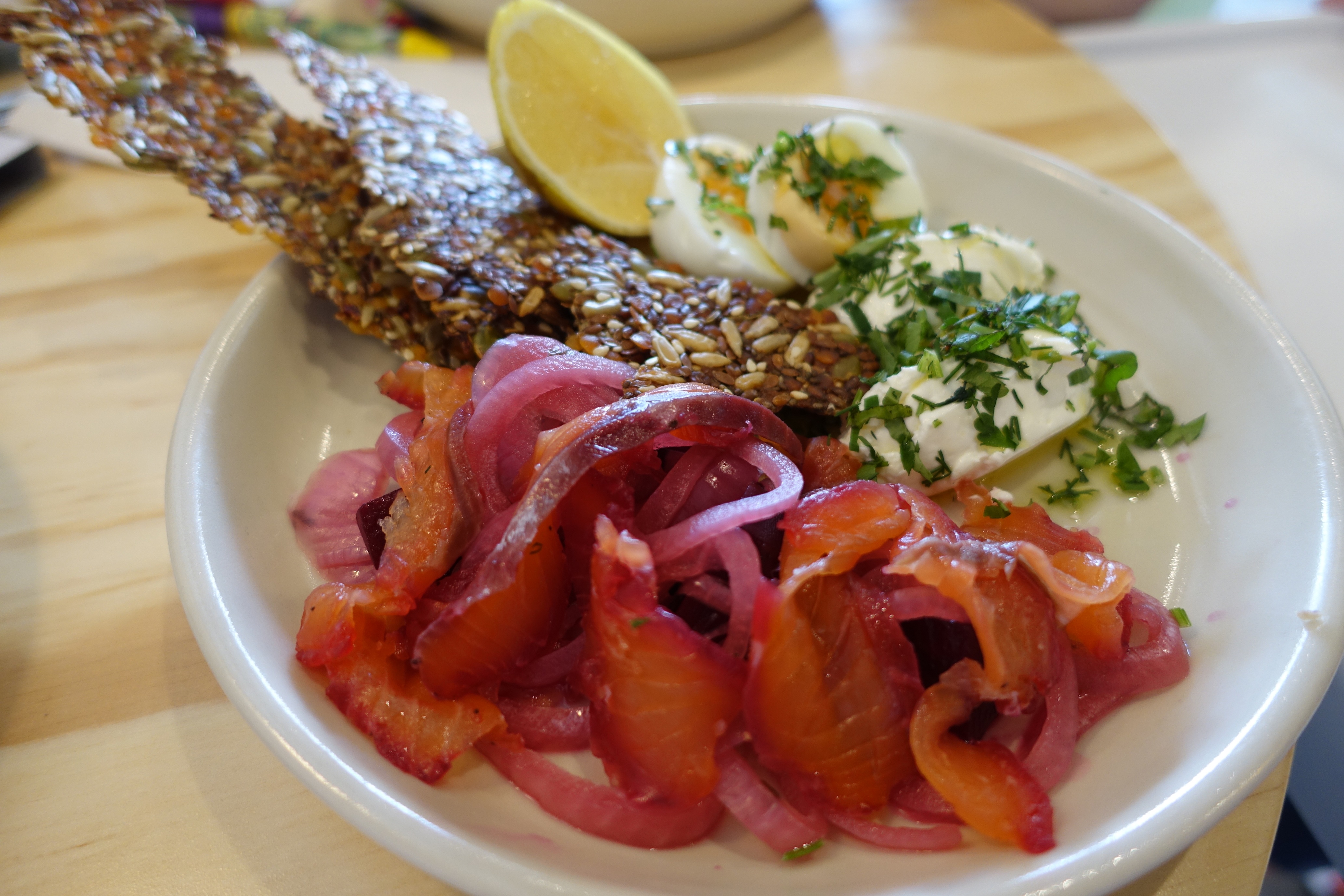 Also sampled at our table was the Beet-cured Salmon, tousled amongst perfectly pink pickled onions and served with soft boiled eggs, lentil & seed crispbread and a herbed labne.