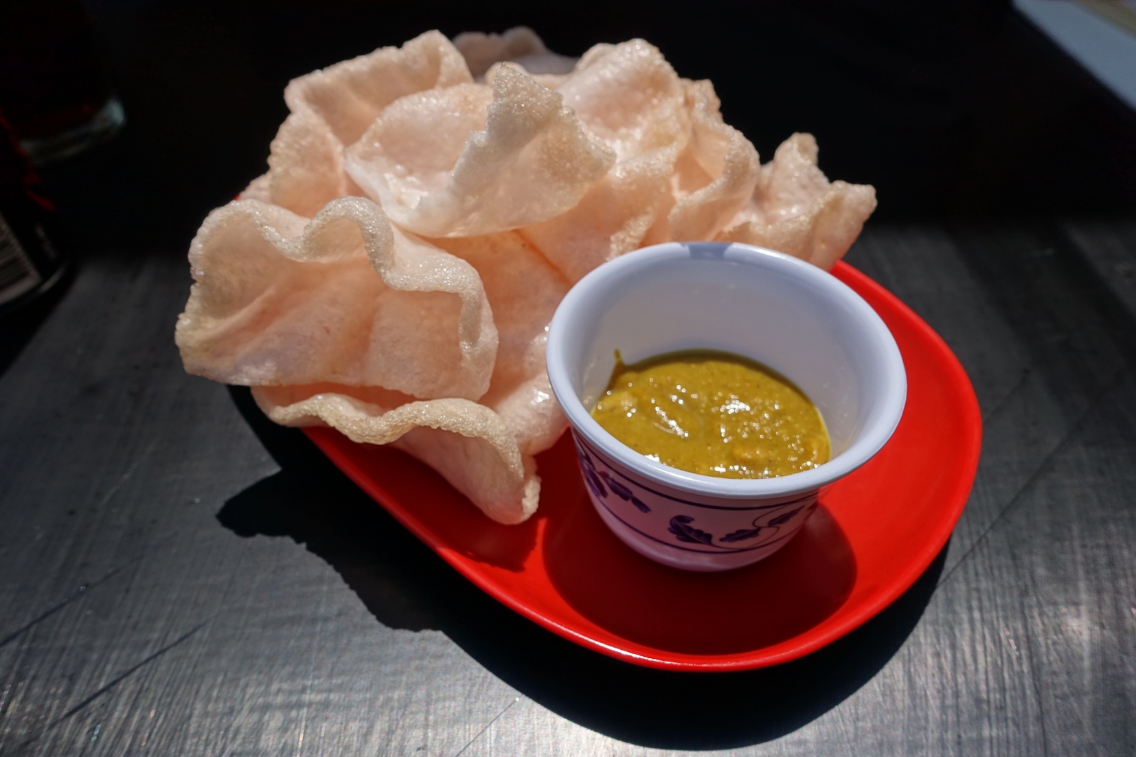 Time for lunch. My fragile state drew me towards the greasier delights on the menu and between a couple of us, we shared the following: Prawn Crackers with Peanut Sauce, South Australian Prawn Toast with Kewpie Mayo and Black Sesame, Duck Rolls (think spring rolls) with Ginger Sweet Chilli Sauce and my favourite, the Thai Barra Dumplings with a spicy ‘Red Sauce’.